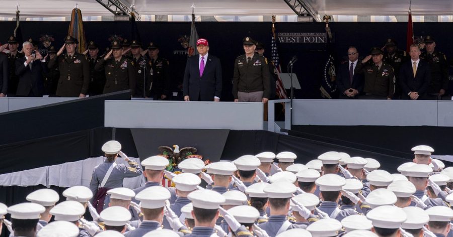 President Trump stands alongside Lieutenant General Steven W. Gilland during the United States Military Academy commencement ceremonies in West Point, N.Y., on May 24, 2025. (Adam Gray, Associated Press)