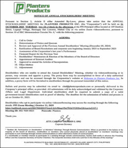 Planters Products, Inc. to hold Annual Stockholders’ Meeting on Oct. 21 via Zoom or in person – BusinessWorld Online