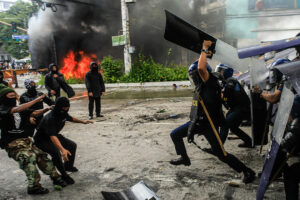 Shortly after, another pocket of unrest broke out in Mendiola near the presidential palace as masked men dressed in black hurled rocks and makeshift Molotov cocktails at police officers holding crowd control lines. Protesters waved the Philippine flag alongside others bearing the Jolly Roger, a symbol associated with piracy, as some ignited makeshift flamethrowers using aerosol cans and lighters. — Kenneth Christiane L. Basilio