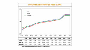 GS yields, which move opposite to prices, declined by an average of 5.32 basis points (bps) week on week, according to PHP Bloomberg Valuation Reference Rates data as of Oct. 10 published on the Philippine Dealing System’s website.