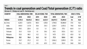 Until 2024, global coal generation was 10,613 terawatt-hours (TWh) vs wind and solar generation which produced 4,623 TWh. As a share of total generation last year, coal had 34% while wind and solar had only 15% (see Table 1).