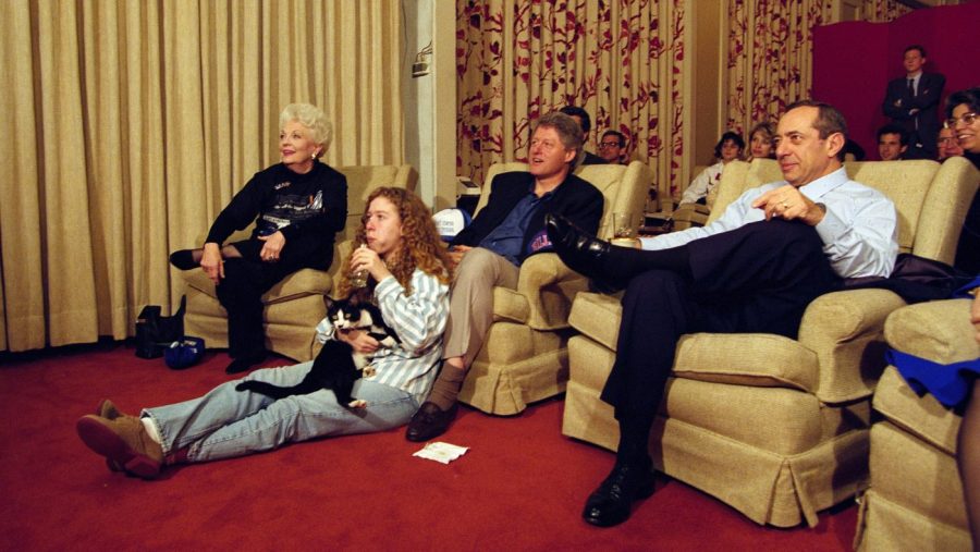 President Bill Clinton, flanked by Govs. Ann Richards of Texas and Mario Cuomo of New York, watches the Dallas Cowboys and Buffalo Bills play at the Super Bowl, with his daughter Chelsea and their cat Socks at the White House, Jan. 31, 1993, in the family theater in the East Wing. (AP Photo/Wilfredo Lee, File)