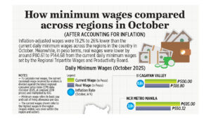 Inflation-adjusted wages were 19.2% to 26% lower than the current daily minimum wages across the regions in the country in October. Meanwhile, in peso terms, real wages were lower by around P80.61 to P144.68 from the current daily minimum wages set by the Regional Tripartite Wages and Productivity Board.