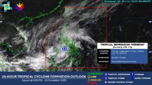 Meanwhile, Tropical Depression Verbena was last located over the coastal waters of Magsaysay, Palawan, the Philippine Atmospheric, Geophysical, and Astronomical Services Administration (PAGASA) said in its latest advisory.